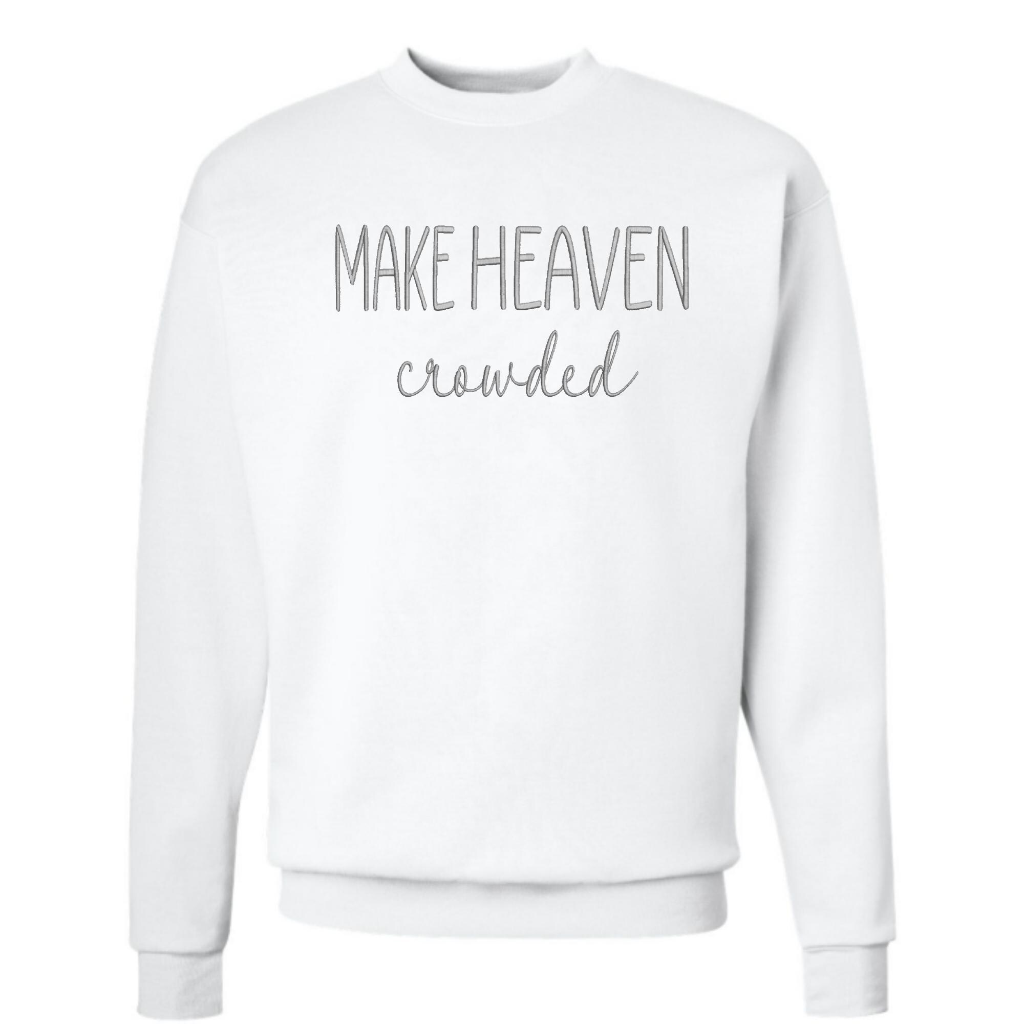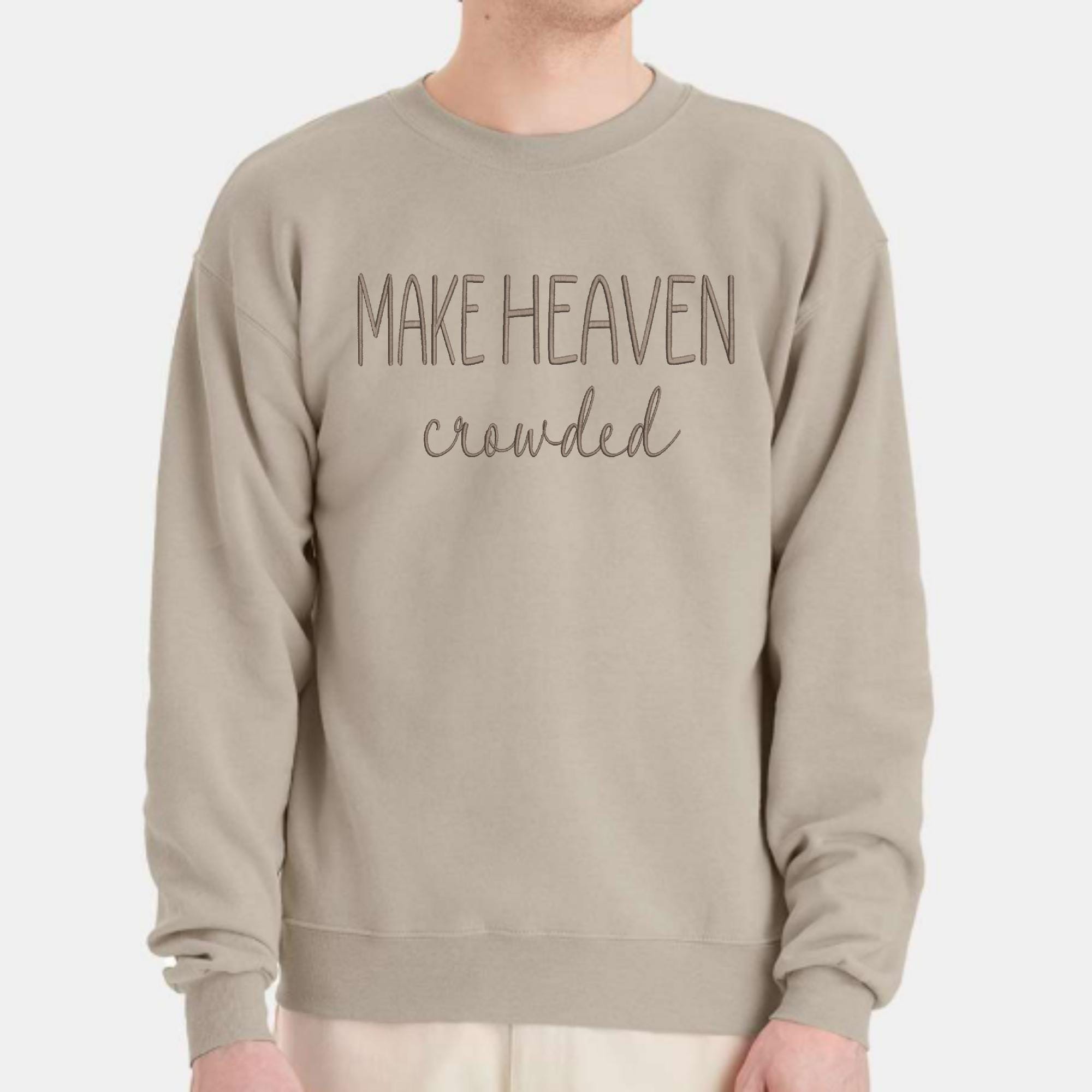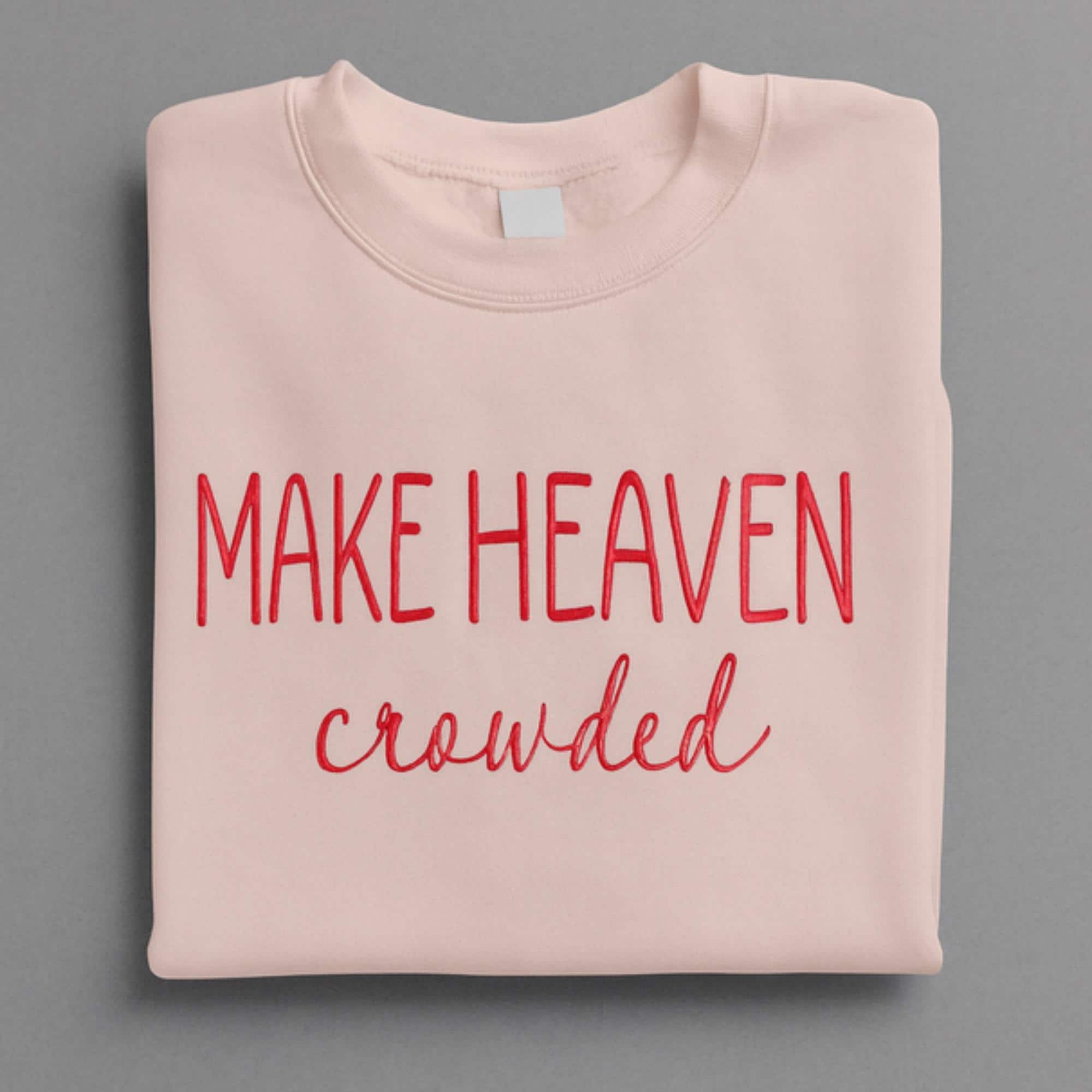 Share your faith in style with our “Make Heaven Crowded” embroidered sweatshirt. This unisex sweatshirt is stitched with care, featuring clean, durable embroidery that makes a bold statement of inspiration wherever you go. ✨ Details: Unisex fit 50/50 cotton-poly blend for softness + durability Classic crewneck style Size up for a trendy oversized look Professionally embroidered, not printed