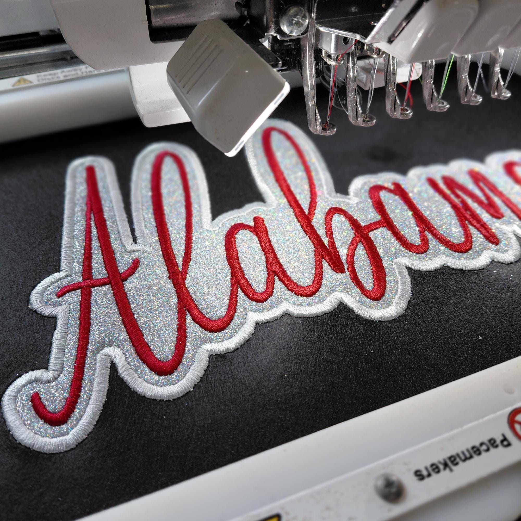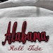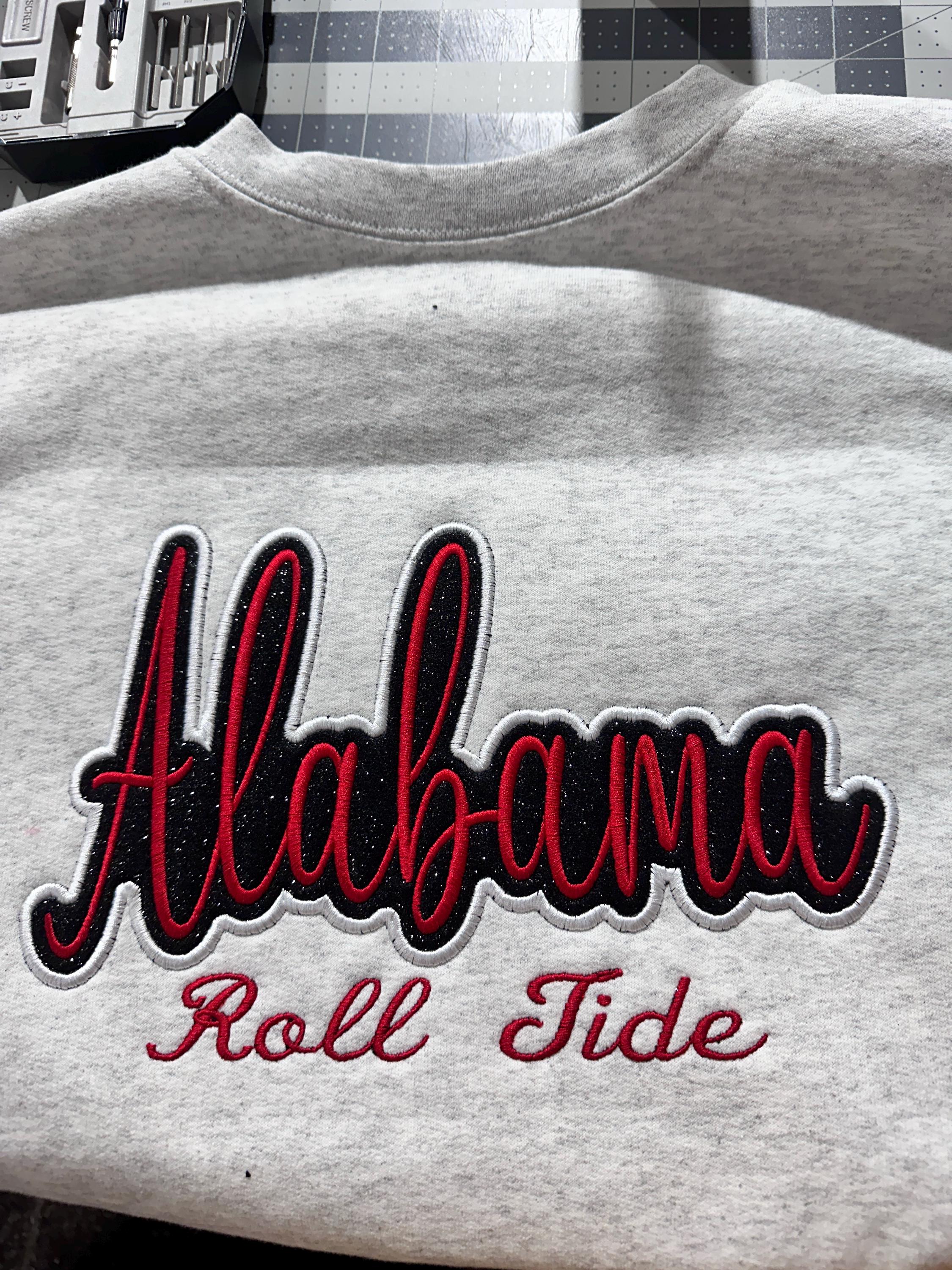 Alabama Applique design for the perfect game day projects, spirit wear, sweatshirts, totes, and more, this machine embroidery file lets you create a quick-stitch design using your favorite glitter vinyl. An oversized design option is perfect for your sweatshirt projects! Details: Design Sizes: 7x4, 8x5, 11x6 Formats include: DST, EXP, HUS, JEF, PES, VIP, VP3, XXX Design MUST be heat pressed according to HTV instructions after stitching is complete.