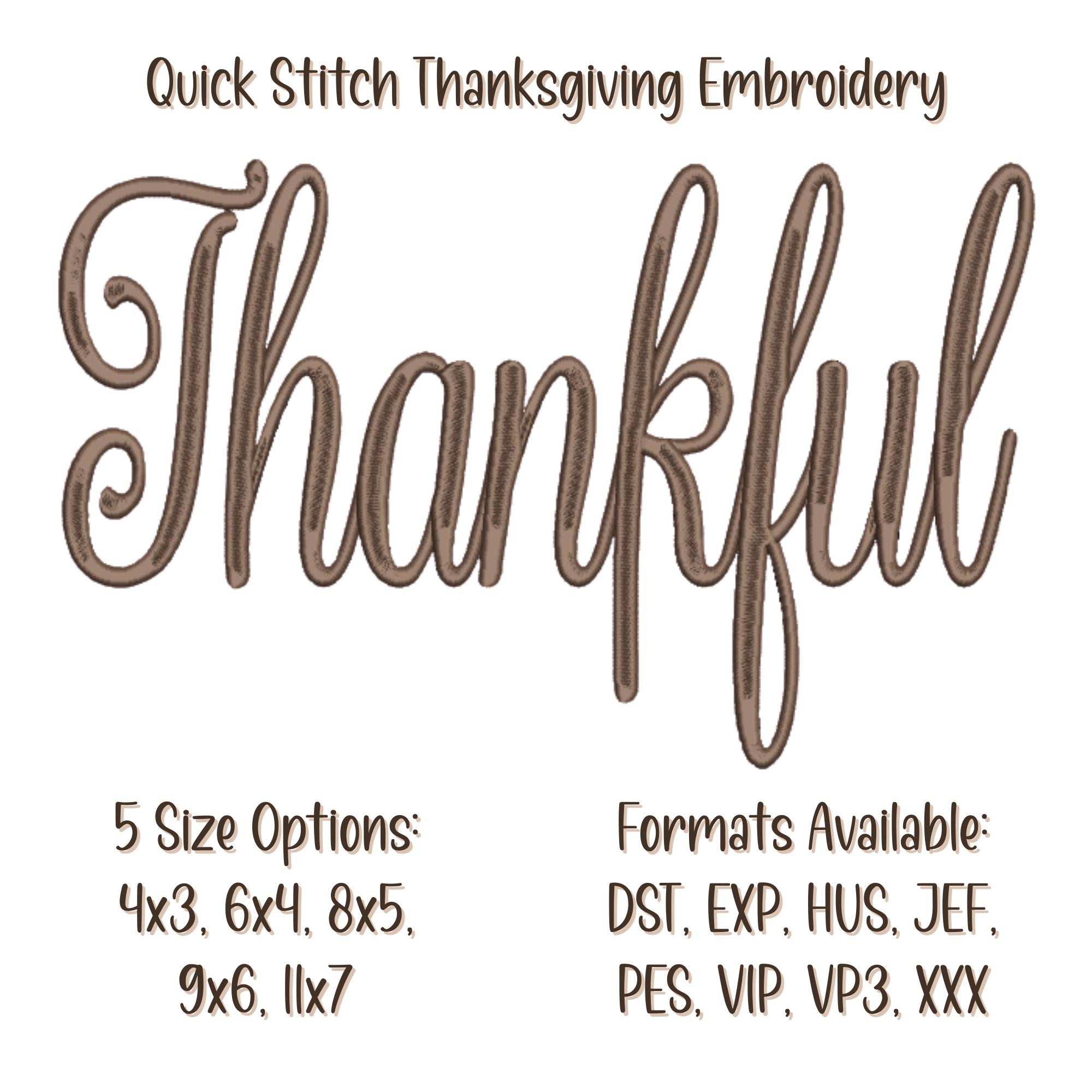 Create your Thanksgiving projects with a quick stitch embroidery design. Many size options to choose from with this file. Never be limited again in your hoop size. We have even included the perfect oversized options for your sweatshirt projects. Details: Sizes include: 4x3, 6x4, 8x5, 9x6, 11x7 Formats Available: DST, EXP, HUS, JEF, PES, VIP, VP3, XXX