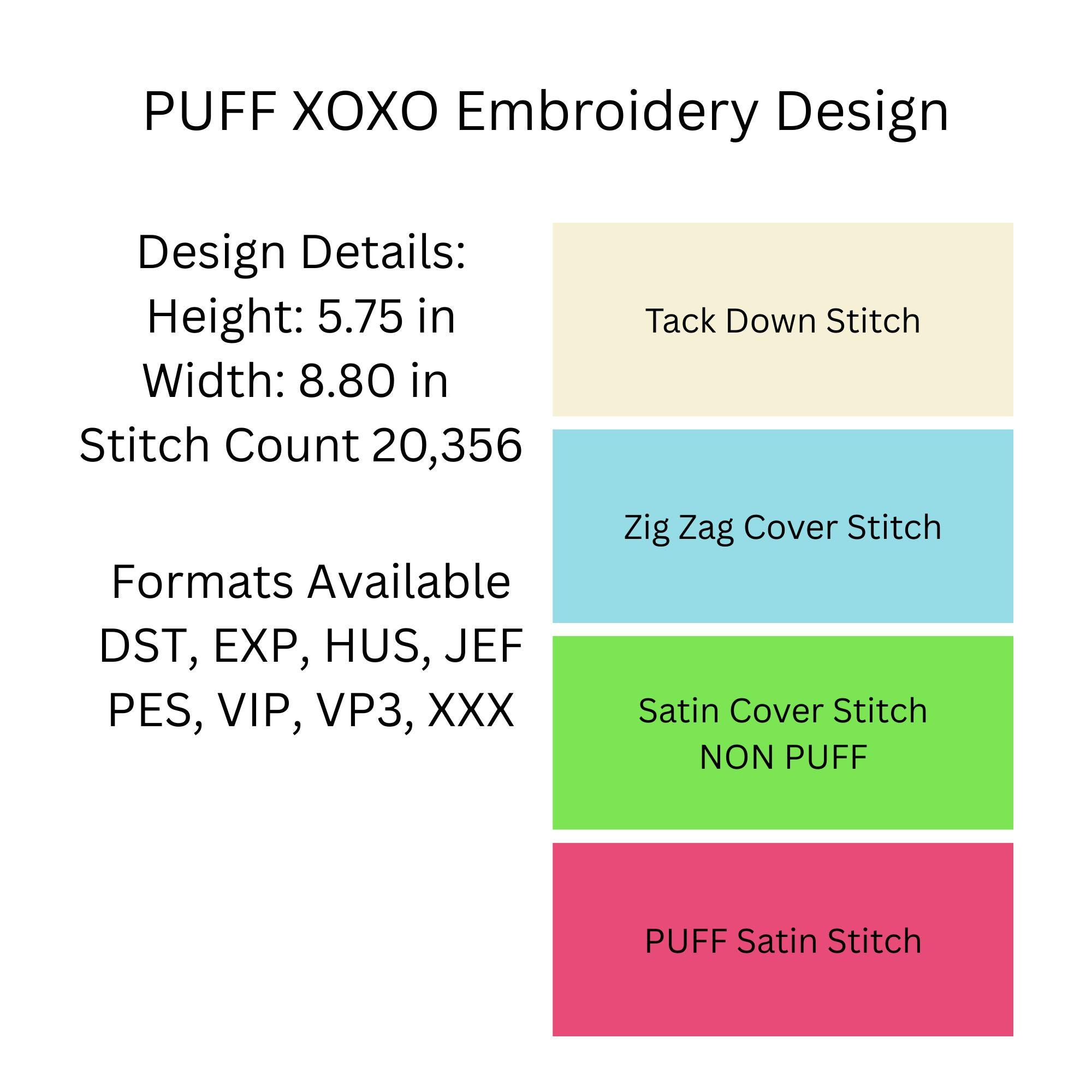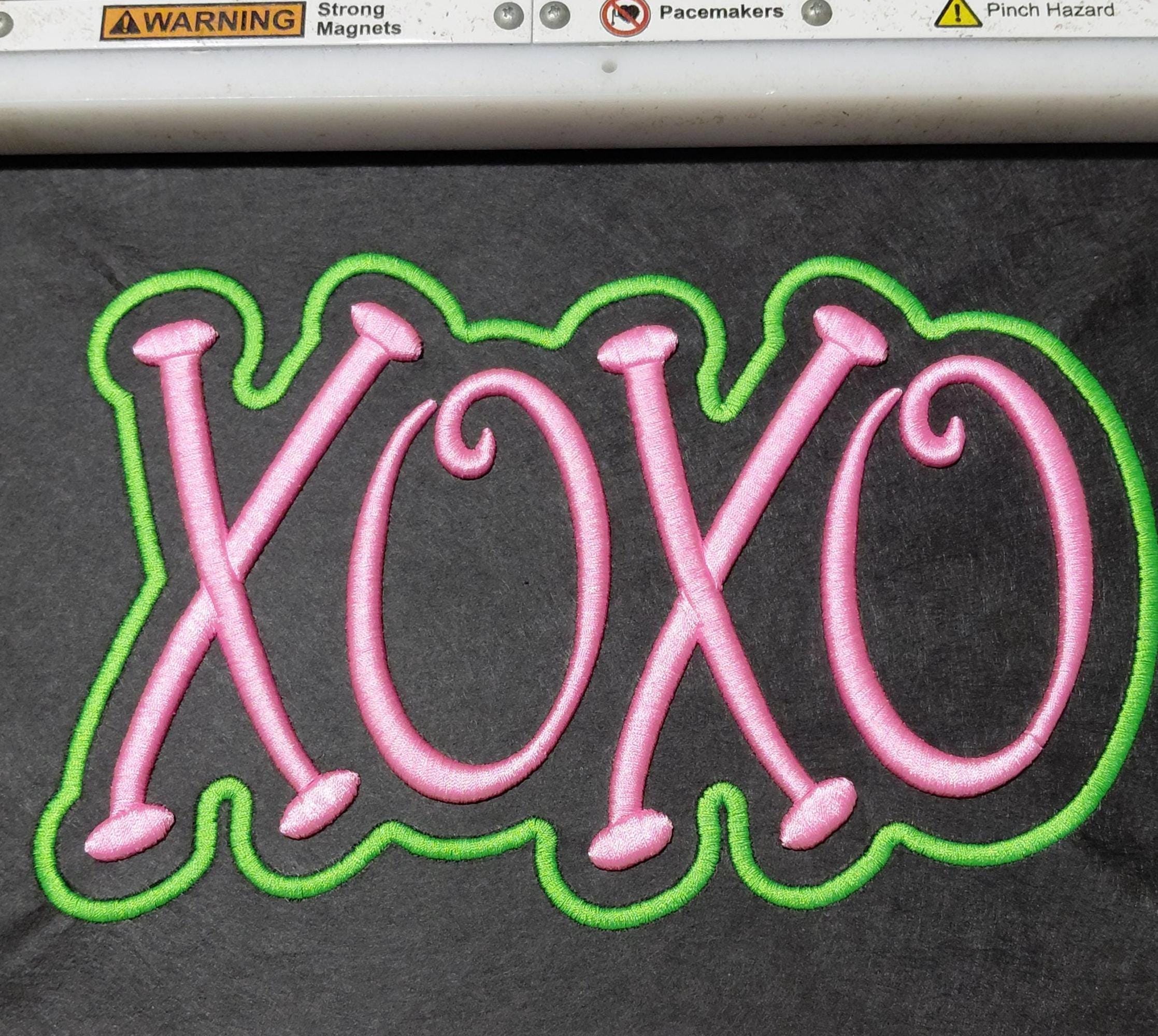 Add a sweet and stylish touch to your embroidery projects with this XOXO appliqué embroidery design. This version features a clean satin-stitched outline and does NOT include puff embroidery, making it perfect for a smooth, classic finish.
