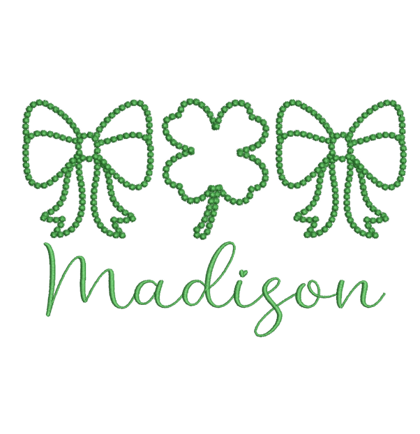 Shamrock and bows with our unique dot motif stitching creates a cute finish for your St. Patty's day projects. This is not an applique design and can not be used as one.