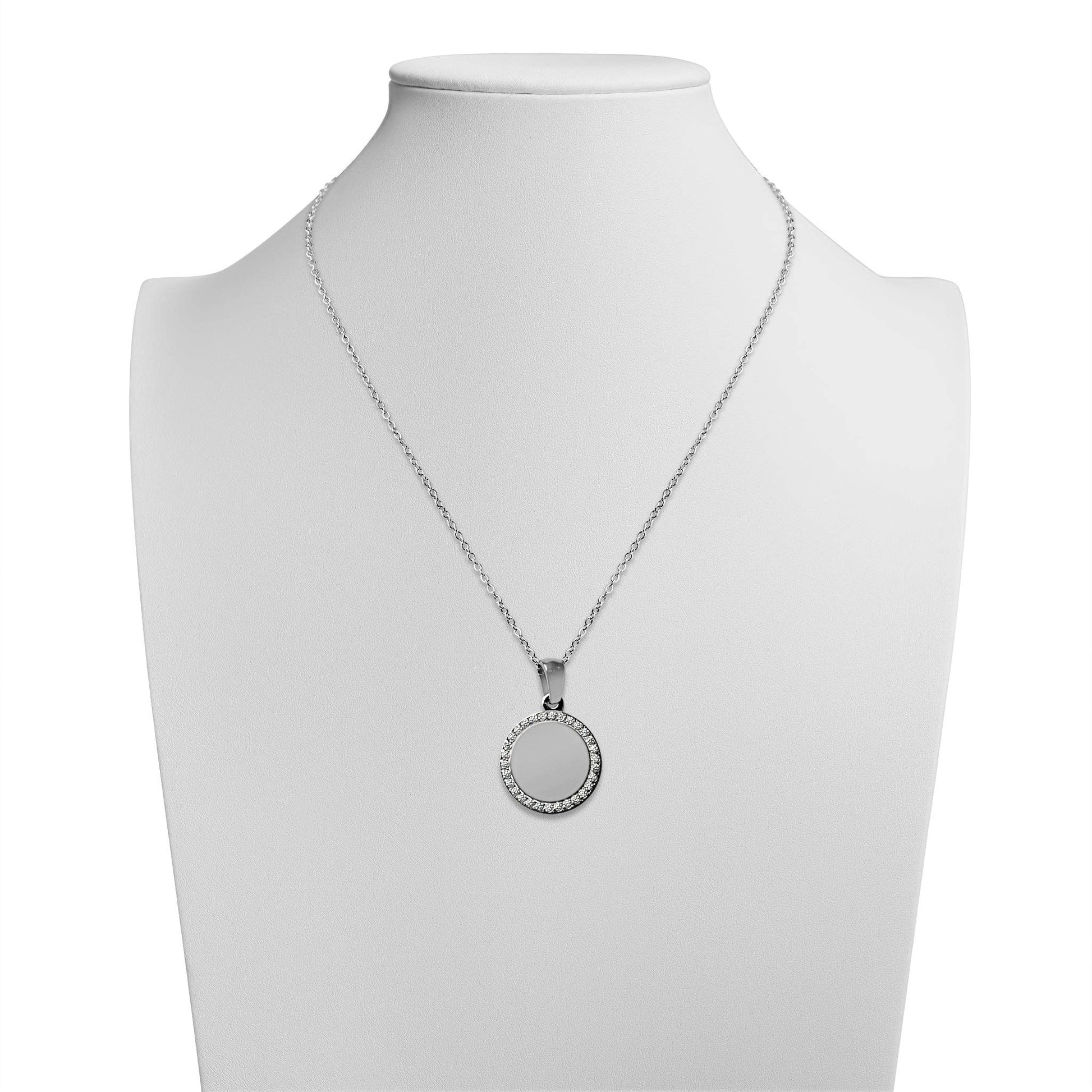 This 18K PVD Coated Stainless Steel Round Pendant Necklace is adorned with an outline of cubic zirconia stones for a striking eye-catching sparkle. Create a unique look with personalization, whether by stamping or engraving customized designs. A chic option for adding a refined touch to any look when worn alone or with other charms.